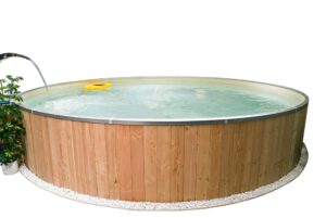 - Rundbecken mit Stahlwand und Folie mit einer Echtholzumrandung versehen.