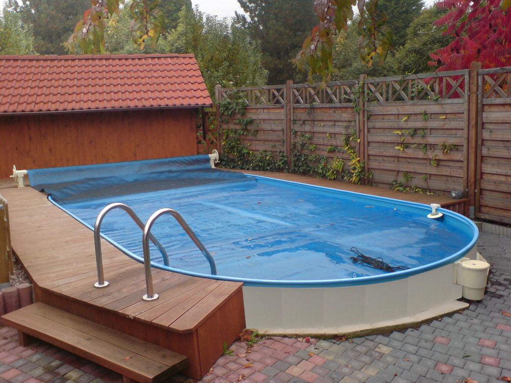 - Safe Top für Ovalbecken mit einem Reisverschluss. Ein Teil wird am Beckenrand befestigt und verbleibt dort. Das Mittelstück der Abdeckung wird durch den Reisverschluss herausgetrennt und im Sommer separat gelagert. Material aus 0,6 mm bzw. 0,8 mm Folie in Adriablau.